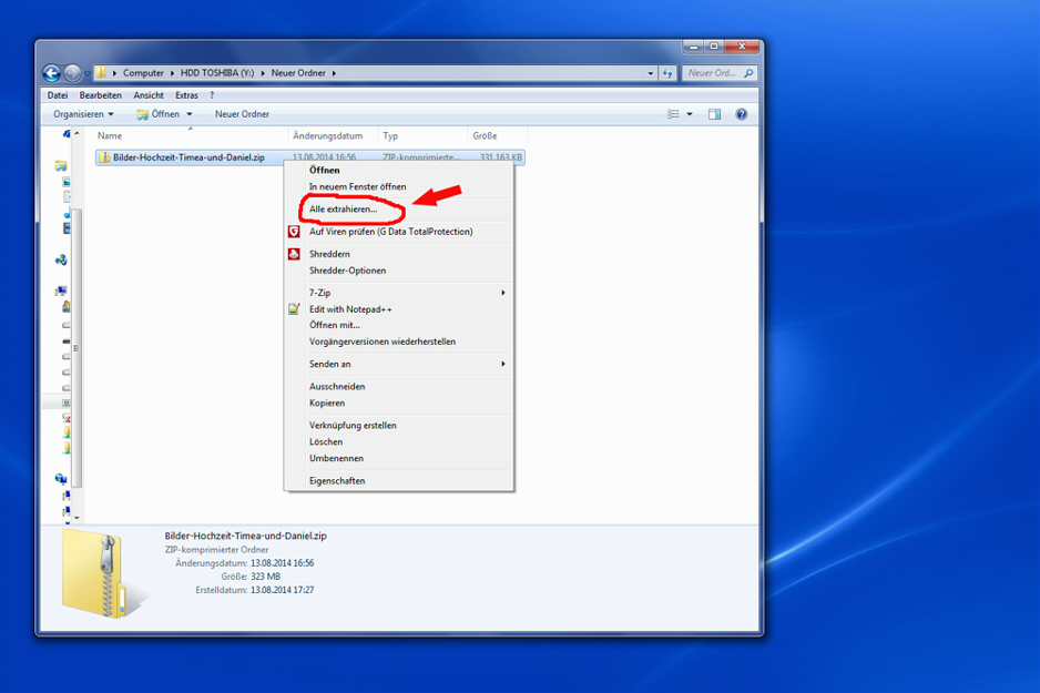 Nach dem Herunterladen des Zip-Ordners, mit der rechten Maustaste auf den Ordner klicken und es öffnet sich ein Menüfenster.